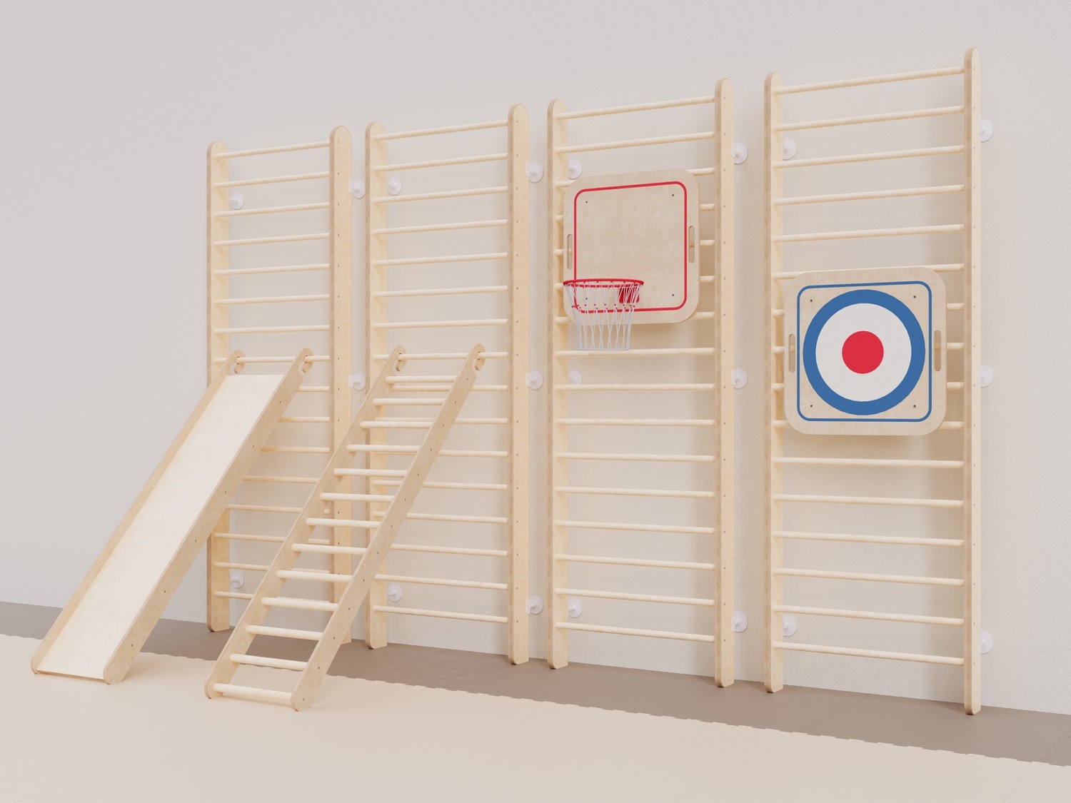 Стенка выполнена из высококачественных и прочных материалов, безопасных для использования детьми. Соответствует актуальным ГОСТам на детскую мебель и инвентарь для спортивных залов, требованиям СанПиН и пожарной безопасности, рекомендациям ФОП ДО по созданию развивающей среды для детей. Гладкие поверхности просты в уходе: достаточно влажной уборки для поддержания высокого уровня гигиены.